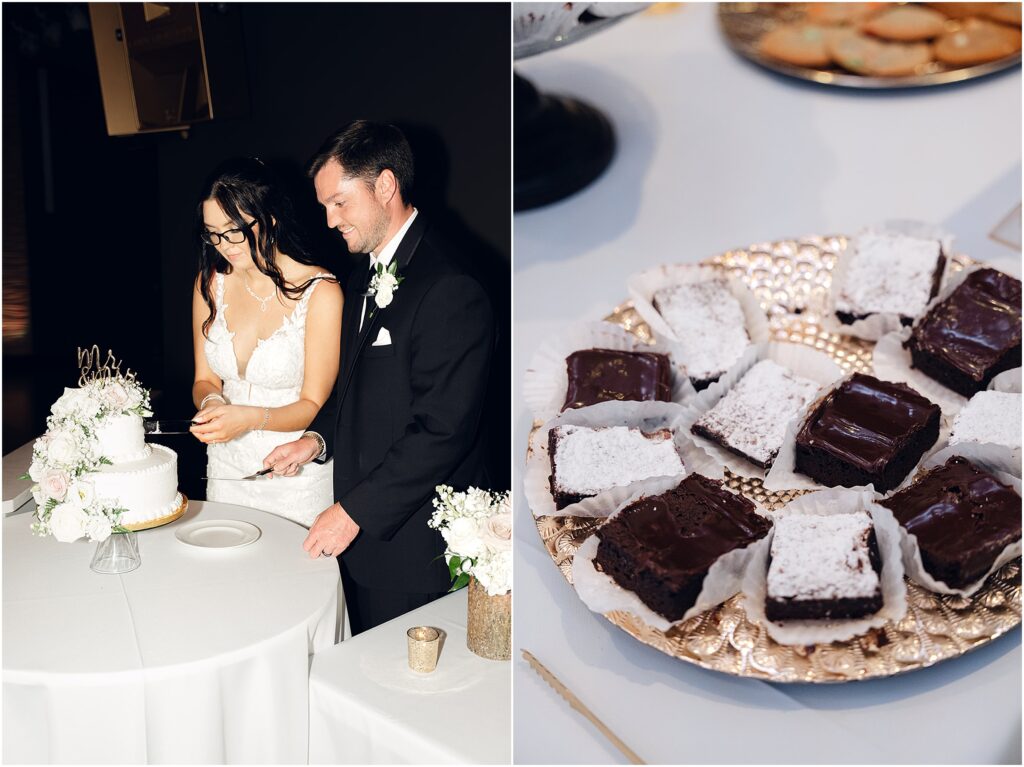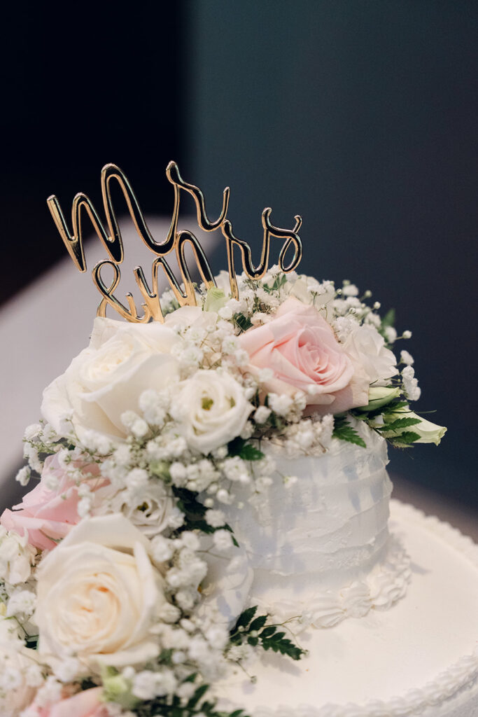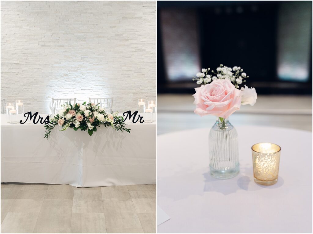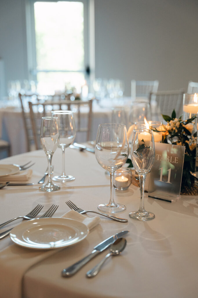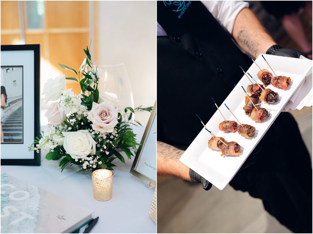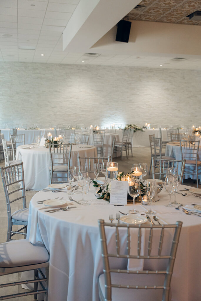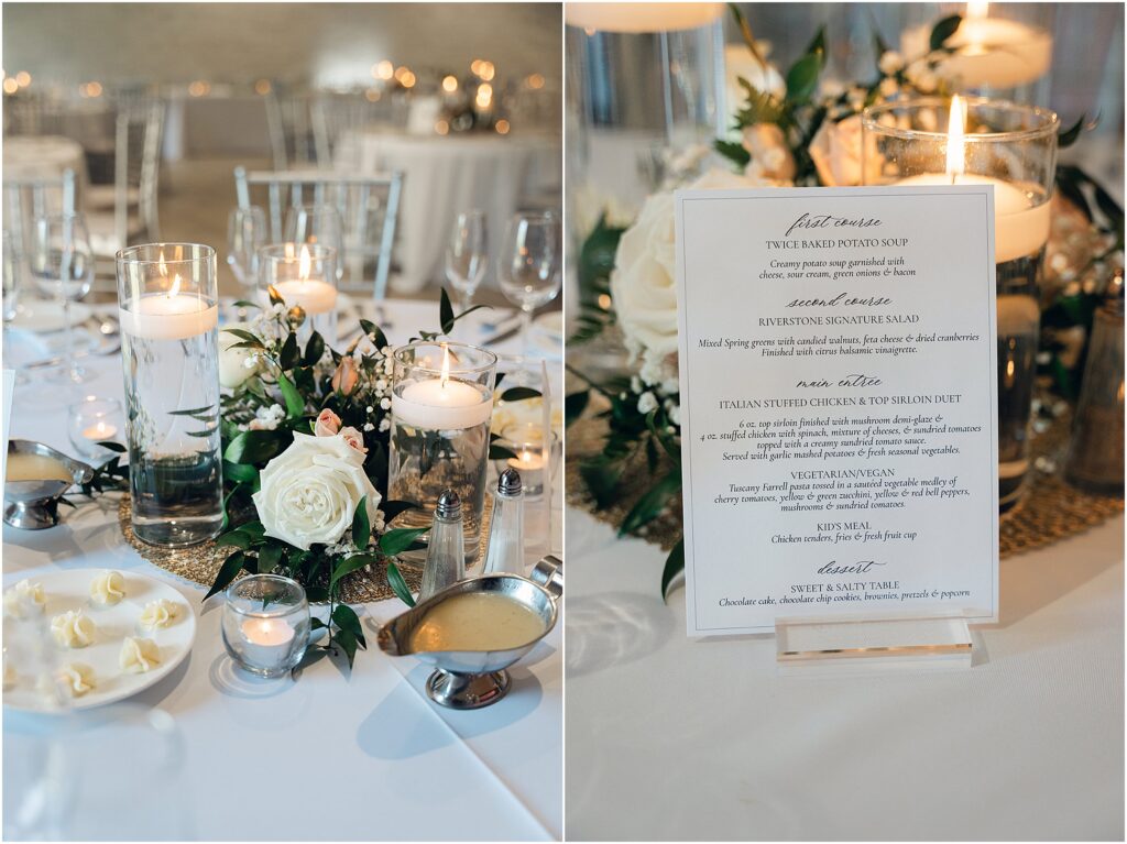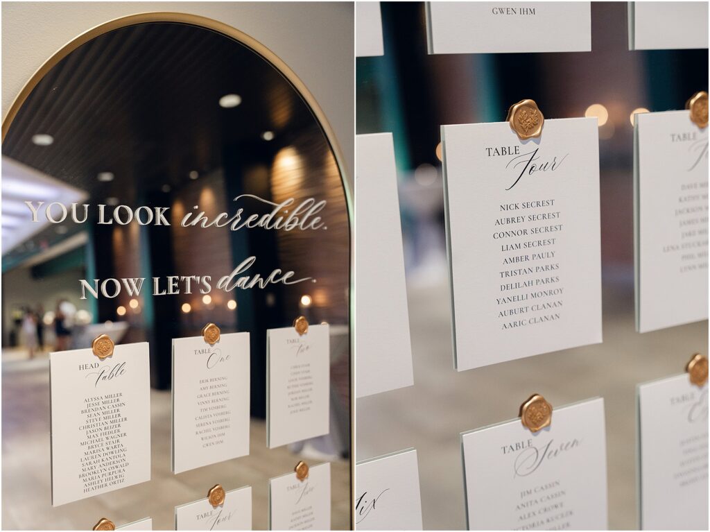 After the “I dos,” guests escaped the heat and made their way inside for cocktail hour and the reception, where the cool air and beautiful setup welcomed everyone in. The RiverStone space glowed with gold accents, candlelight, and chic modern details that perfectly complemented the couple’s style. I had the pleasure of creating some fun modern touches for their day, including a welcome sign setup, dinner menus, dessert menu, table numbers, and an escort mirror for guests to find their seats.