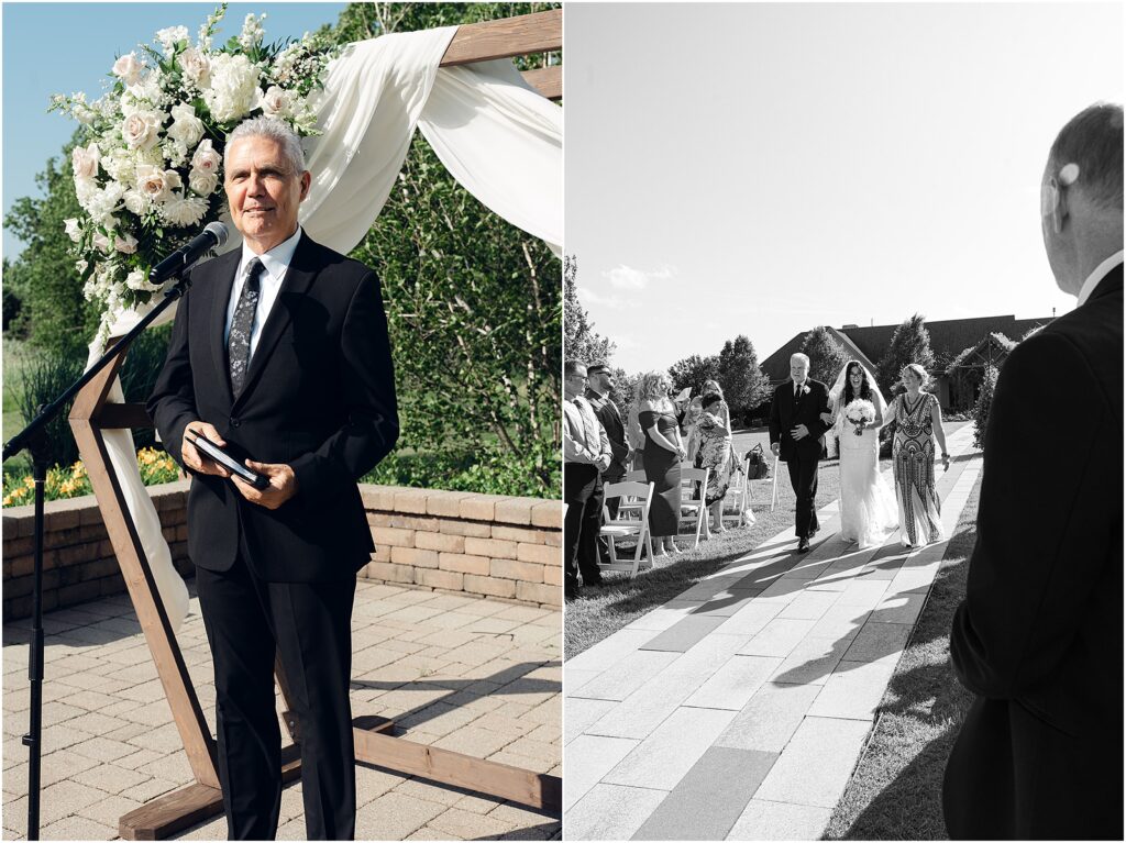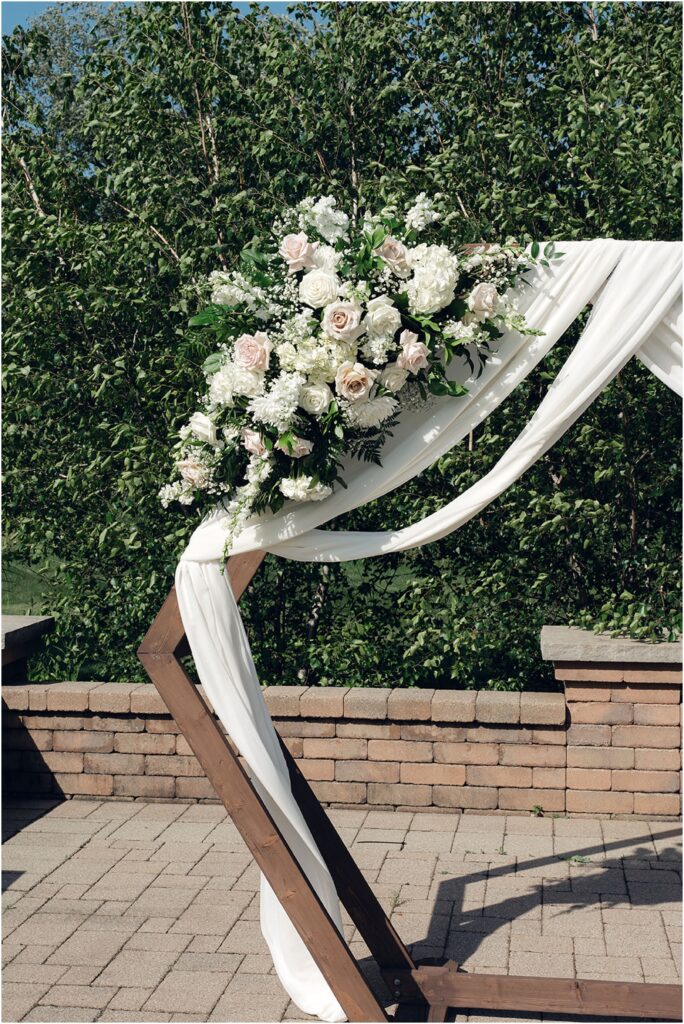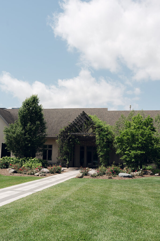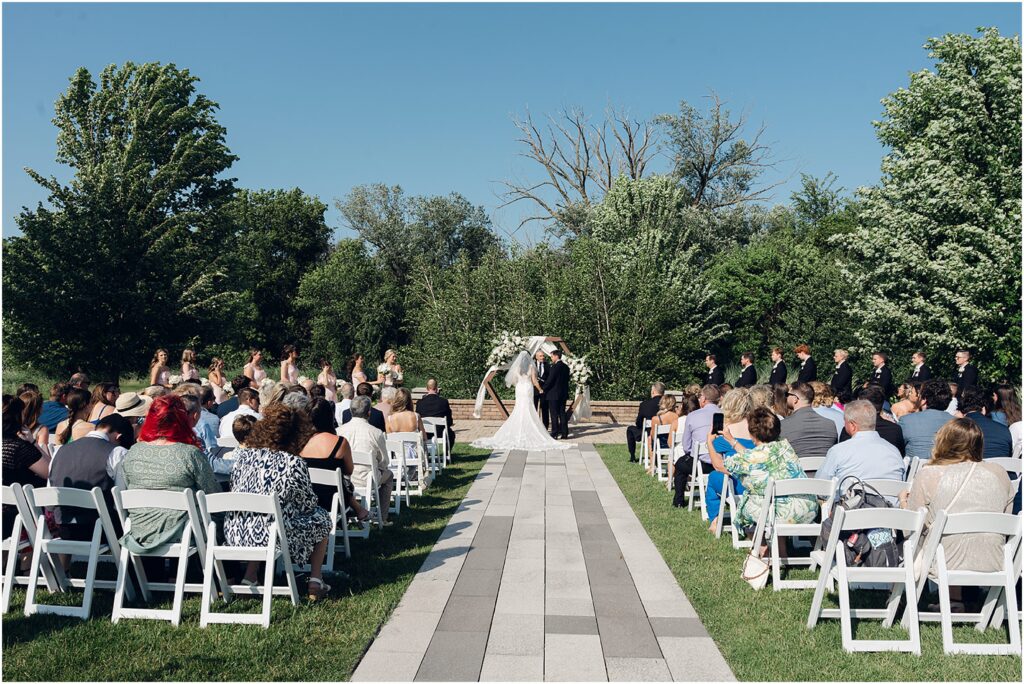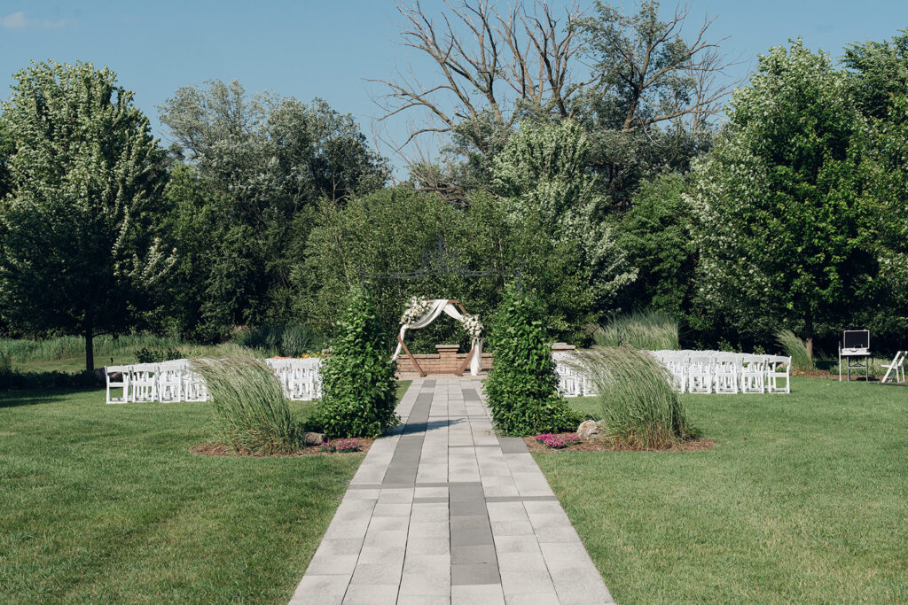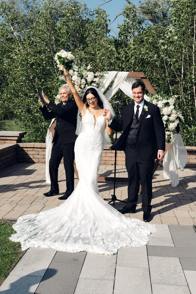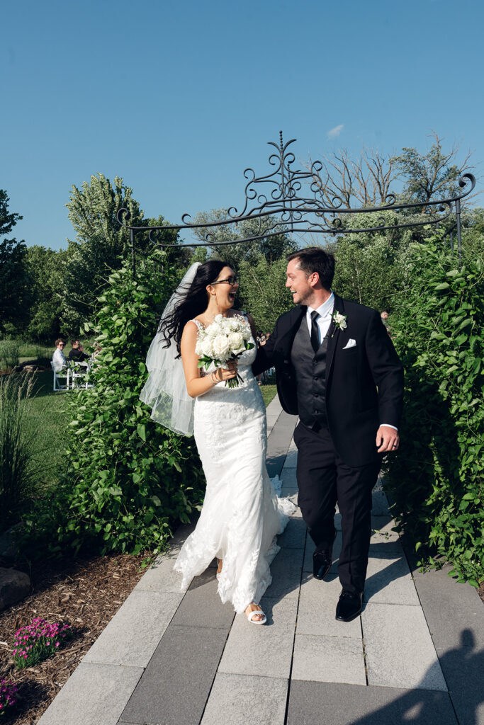 Their outdoor ceremony was very picturesque – set against the backdrop of wooded trees with a long stone aisle walkway, the soft blush and white floral arch, lush greenery, and touches of gold created a scene that was equal parts modern and romantic.